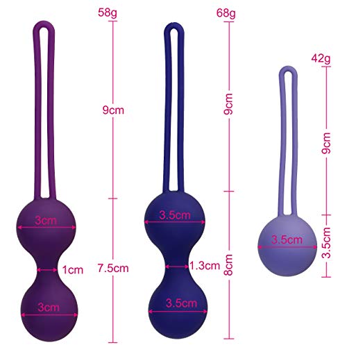 - ? PAQUETE DISCRETO: 3 bolas erĂłticas suaves de color morado en diferentes tamaños y pesos: â Nivel 1: Ă 35 mm - 42 g â Nivel 2: Doble bola Ă 30 mm - 58 g â Nivel 3: Doble bola Ă 35 mm - 68 g