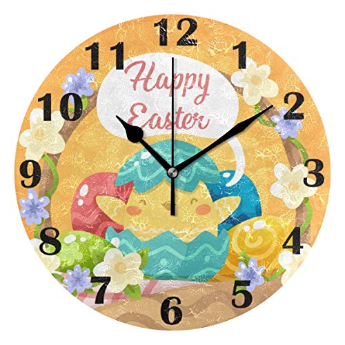 Jacque Dusk Reloj de Pared Moderno,Feliz Pascua Pollito Huevo Flores Conejito,Grandes Decorativos Silencioso Reloj de Cuarzo de Redondo No-Ticking para Sala de Estar,25cm diámetro