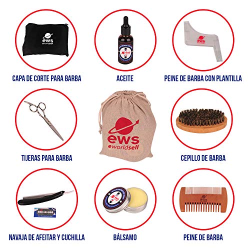 Kit de cuidado profesional para barba y bigote: aceite hidratante, cera natural, cepillo, peine de madera, tijeras, navaja y perfilador de afeitado - Set de productos y accesorios para barbero