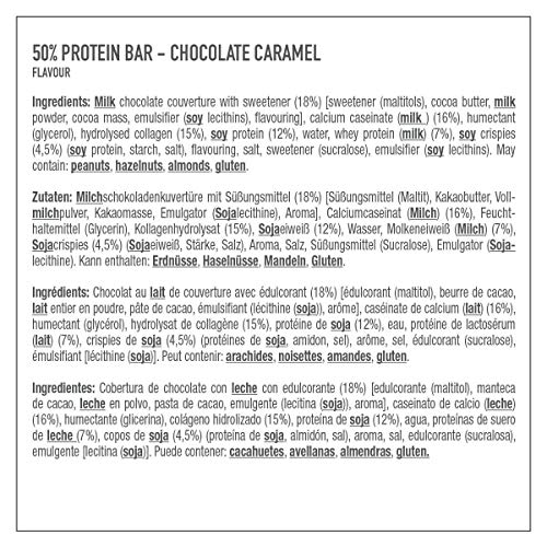 - Barrita de proteínas sabor galleta y nata con una capa de caramelo sabor chocolate y cobertura sabor chocolate con leche, con edulcorantes