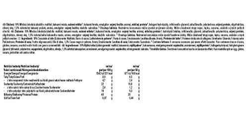 - Valores de nutrición por barrita: 188kcal (Proteínas 19,6g; Hidratos de carbono 18,4g; Fibra alimentaria 8,7g; Grasas: 4,6g)