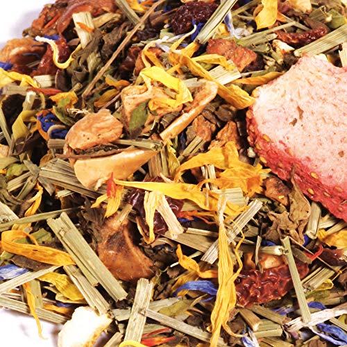 Tisanas. Té de Hierbas para Niños. Sabor a Fresa y Naranja. Con menta, caléndula, manzana, piña, citronela, trozos y piel de naranja, fresa, aciano, cártamo. 100 gramos