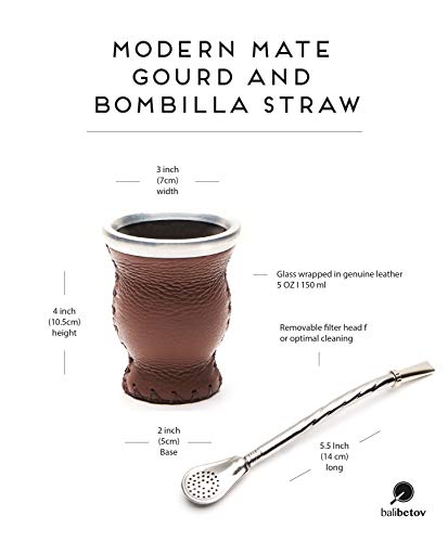 BALIBETOV Mate Argentino - Set de Mate de Vidrio Forrado en Cuero - Alternativa Mate de Calabaza - con Bombilla (Sorbete) para Yerba Mate. (Marrón)