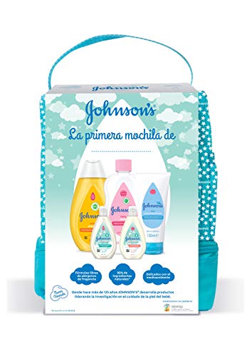 Johnson's Baby Pack Bebe Mi Primera Mochila, Champu Clásico 300 ml, Aceite Corporal 300 ml, Crema Protectora de Pañal 100 ml, Loción 50 ml, Gel 50 ml