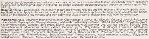- Tratamiento intensivo que reduce y elimina las manchas existentes y previene la aparición de nuevas de origen solar o del paso del tiempo, con una combinación de activos que incorpora la exclusiva tecnología despigmentante B-CORE 221TM.