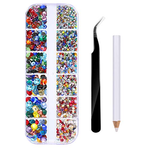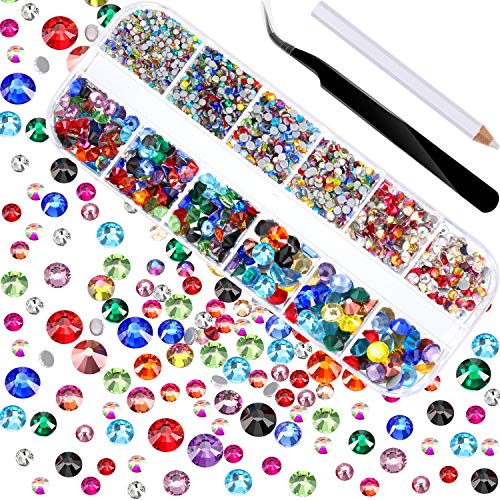 2000 Piezas de Diamantes de Imitación de Espalda Plana de Vidrio Hot Fix Gemas Cristales Redondas 1,5-6 MM (SS4-SS30) en Caja de Almacenamiento con Pinzas y Bolígrafos de Diamantes(Multicolor)