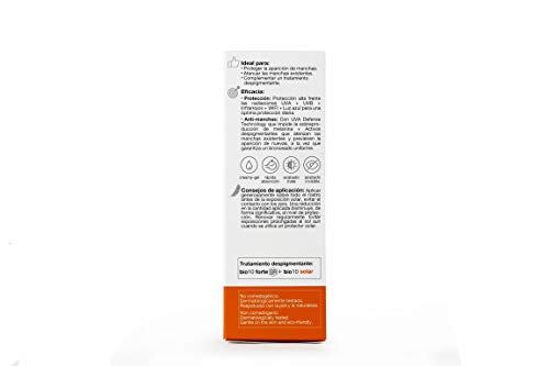 - Acción despigmentante: atenúa manchas; protege y repara el adn celular; acabado seco y mate; no comedogénico; resistente al agua