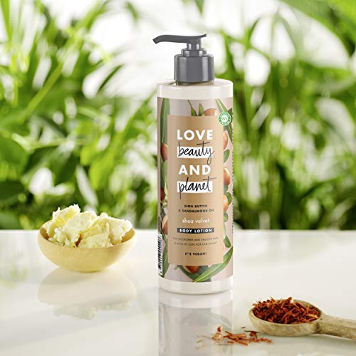 - La Loción corporal Love Beauty and Planet Manteca de Karité y Sándalo nutre la piel y le proporciona un cuidado complaciente