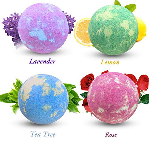 - [BATH BOMBS]: La variedad de aceites de bombas cuatro baños cada uno hace que estas bombas de baño constituyan uno de los regalos de bombas de baño mÔs deseables del mercado. Los aromas son rosa, lavanda, Ôrbol de té y limón. El peso de cada bomba es de 112 g, 6 cm.