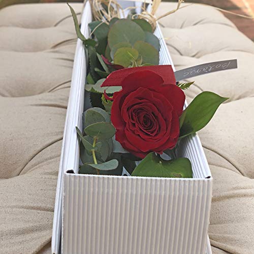 - Elaborado con gran rosa roja natural de calidad extra, tallos de eucalipto parviflora, espigas, lazo rojo vivo de algodón y cuerda de yute. Medidas: 8x8x65 cm. Colores: Marrón, verde y rojo. Materiales: Cartón, rosa natural, espigas, verdes naturales. Montada en caja rectangular de cartón Kraft rígido con tapa y faja decorativa