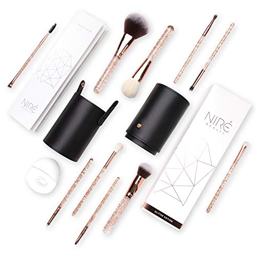 Essential Glow Set de Niré Beauty Brochas de maquillaje de Purpurina con Estuche de brochas y Cepillo de limpieza facial