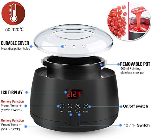 - ✿【PANTALLA LCD Y PANTALLA TÁCTIL】— Viene con una pantalla LCD de temperatura que se pueden acomodar fácilmente los cambios de temperatura de la cera en el interior, lo que evita el escaldado innecesario. Temperatura ajustable: de 50℃ a 120℃(122℉-248℉)