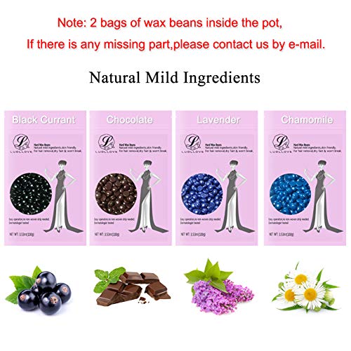- Kit de Calentadores de cera para depilación: Cuenta con frijoles de cera dura de 4 diferentes sabores, 30 palitos aplicadores de cera, que son fáciles de usar. elimina el 98% del vello corporal no deseado desde sus cejas, brazos, axilas, área del bikini y piernas, dejando la piel limpia y suave de pies a cabeza.