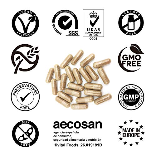 - ? MÁXIMA CALIDAD Y GARANTIA DEL 100%: Nuestro producto es Vegano, Libre de Citrininas, Sin Gluten, Sin Lactosa, Sin Soja, Sin Estearato de Magnesio, Sin Azúcar, Sin Conservantes ni Colorantes, Sin aromas añadidos, No transgénico (GMO Free), Fabricado en España bajo certificados GMP e ISO | Hivital Foods está registrada en AECOSAN con número 26.019181B | Y además, 100% SATISFACCIÓN GARANTIZADA ¡Si no quedas completamente satisfecho, te devolvemos tu dinero!