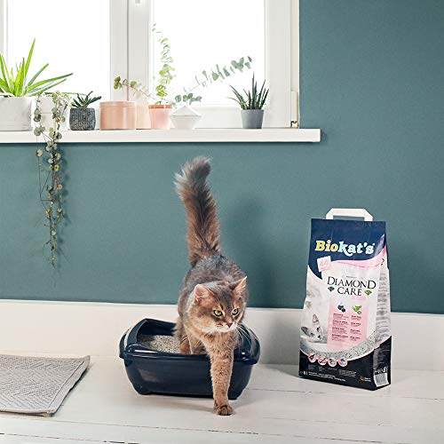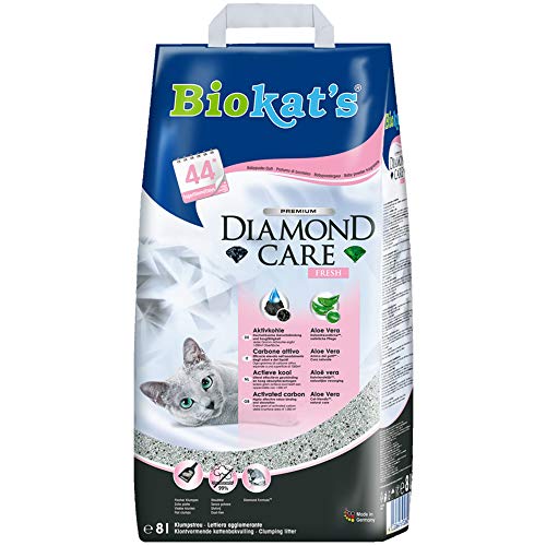 - Contenido: 1 x 8 l Arena higiénica sin polvo Biokat Diamond Care Fresh con carbón activo muy absorbente, bloqueador de los olores y una suave esencia de aloe vera - hecho en alemania