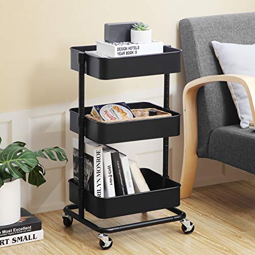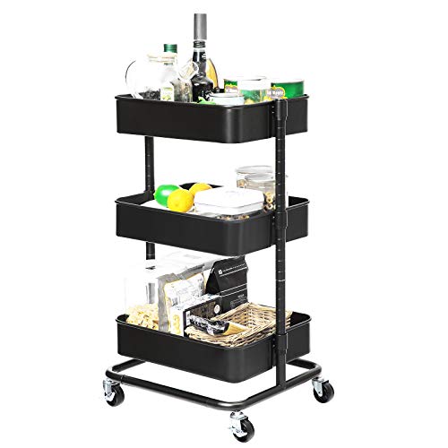 SONGMICS Carro de Almacenamiento de 3 Niveles, Estantería con Ruedas, con Estantes Ajustables en Altura, con 2 Frenos, Montaje Sencillo, para Baño, Cocina, Oficina, Negro BSC60B