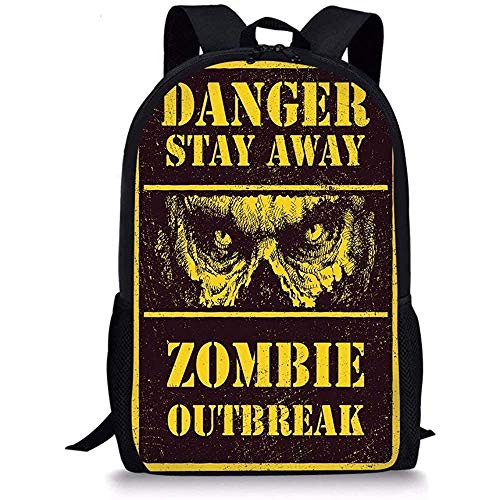 Hui-Shop Mochilas Escolares Zombie Decor, Peligro Manténgase alejado Brote Mensaje Monstruo Señal de Advertencia Gráfico Castaño Marrón Amarillo para Niños Niñas