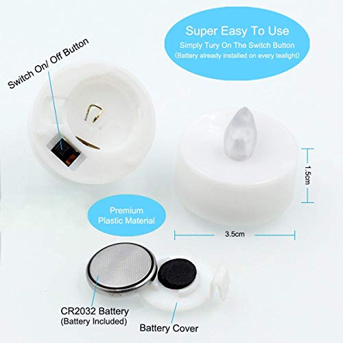 - Larga vida y ahorro de energía y sin humo: Estas velas de luz LED para té sin llama son completamente ecológicas. Tienen emisión de carbono CERO. La luz LED alimentada por una sola celda de botón reemplazable CR2032 (incluida e instalada), se estima que dura más de 60 horas con una batería nueva.
