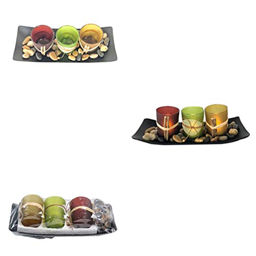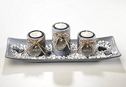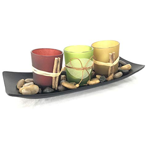 - Cuenco decorativo con 3 portavelas de madera rectangular color gris incluye piedra decoración