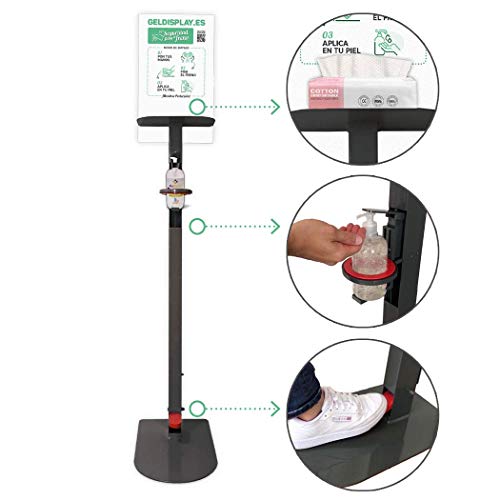 TOTEM GELDISPLAY - Dispensador de Gel Hidroalcohólico y desinfectante de manos - Soporte para guantes o toallitas - Sin Contacto Mecánico - Sin Instalación - Funciona con un pedal