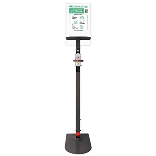 - Está adaptado a la mayoría de los geles hidroalcohólicos de mano del mercado, pudiendo utilizar cualquier gel con un diámetro de entre 80 y 105mm, y pudiendo regularlo luego en altura para que pueda ser usado por adultos y niños