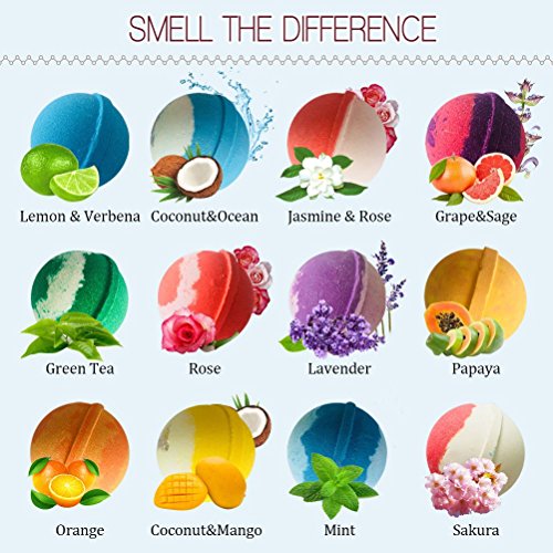 - ? 12 Colores ? Cada bomba de baño hecha a mano pesa 3 OZ (2.2 pulgadas de diámetro, más grande que una pelota de golf), todas con efectos de más duraderos, le brindan una experiencia de nivel de spa con un baño colorido natural
