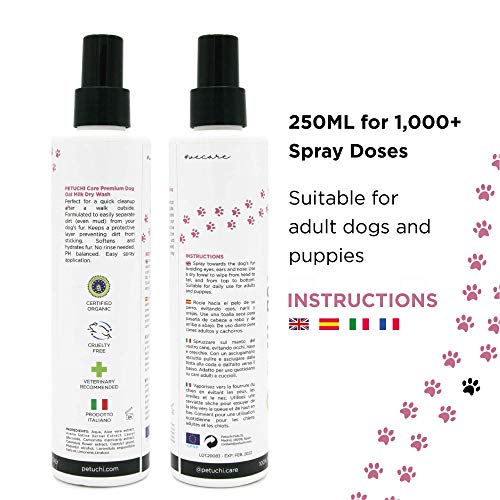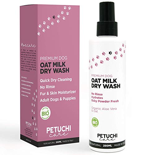 PETUCHI ChampĂș Seco para Perros; Spray Bio con Aloe Vera y Leche de Avena; Aroma a Talco Fresco; No Necesita Aclarado; 250ml