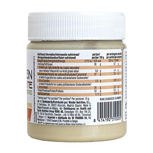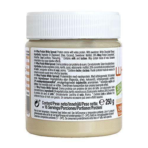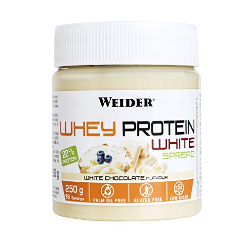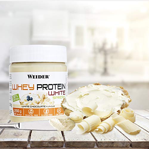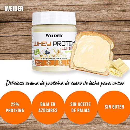 Weider Whey Protein White Spread 250 g. Crema de chocolate Blanco con 22% de proteínas Baja en azúcares Sin aceite de palma y sin gluten.