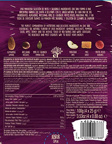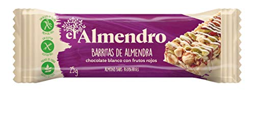 El Almendro - Barritas de Almendra, Chocolate Blanco y Frutos Rojos - 4x25 gr - Sin Gluten - Sin Aceite de Palma - Fuente de Fibra