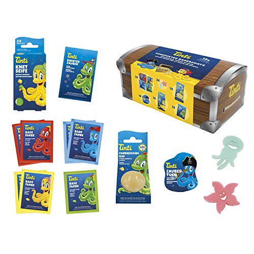- Contenido: 7 x Tinti badefarbe (2 x azul, 2 x amarillo, 2 x rojo, 1 x verde), 1 x Tinti knisterzauber, 1 x Tinti knisterzauber, 1 x Tinti knisterzauber, 1 x Tinti Farbwechselbad, 1 x Tinti zaubertuch y 2 x Tinti esponjas (diseƱo variado).