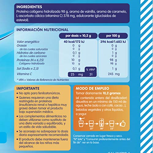 - 10 gramos diarios de colágeno; envase para 30 días; se requiere un mínimo de tres meses para apreciar resultados