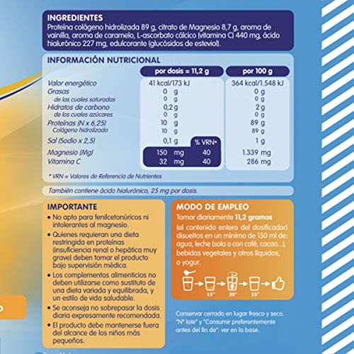 - Complemento alimenticio a base de proteína de colágeno hidrolizada (natural, muy asimilable y pura) enriquecida con magnesio, vitamina C y ácido hialurónico