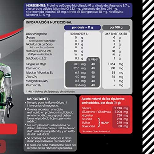 - Complemento alimenticio a base de proteína de colágeno hidrolizada (natural, muy asimilable y pura) enriquecida con magnesio, manganeso, zinc y vitaminas B y C