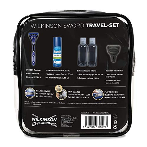 Wilkinson Sword Set de Viaje con Máquina de Afeitar Recargable de 5 Hojas + Protector de Viaje + Espuma de Afeitado Protect 50 Ml + 2X Botes Rellenables 100 Ml + Neceser de Viaje