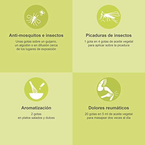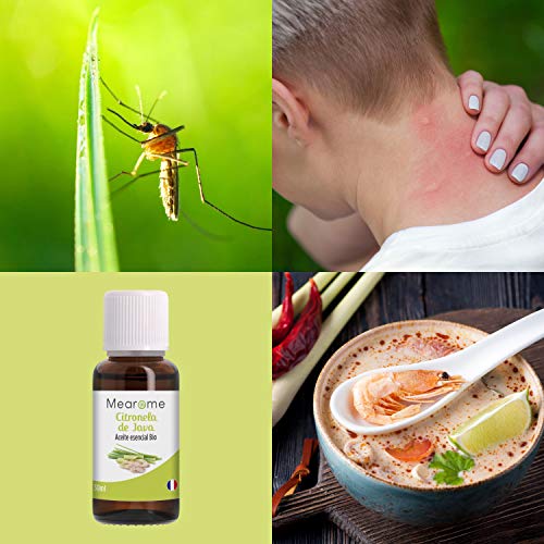 - CITRONELA BIO : Aceite Esencial de Citronela Refrescante y purificante con un aroma intenso cítrico, dulce y fresco. En aromaterapia y masajes por sus propiedades calmantes y purificadoras. Relax Antimosquitos 100% Natural con aceites esenciales y vegetales. Evite los sarpullidos, los granos y las cicatrices ocasionadas por rascarse compulsivamente tras la picadura de un mosquito. Ahuyentador de Mosquitos también ayuda como analgésico sobre golpes y contusiones y alivia los dolores musculares