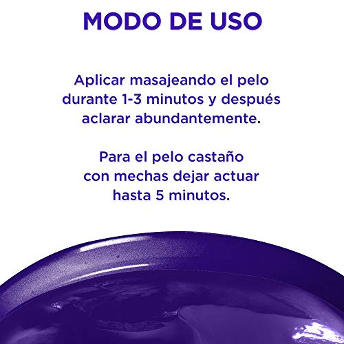 - Recomendamos aplicar una vez por semana dejándolo actuar 5 minutos para cabellos rubios, 10 minutos para castaños y 1 minuto para grises o blancos