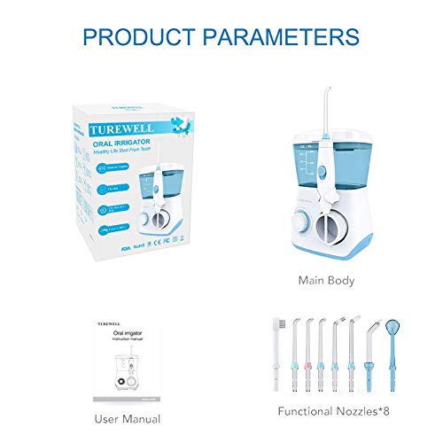 - ❤ Limpieza profunda de pulsaciones potentes Elimine el 99,99% de los residuos: el irrigador dental TUREWELL viene con una pulsación de agua de 1250-1700 veces, lo que facilita la eliminación de suciedad dañina entre los dientes y un masaje en la encía que el hilo de hilo normal. El Dental Oral lrrigator previene eficazmente la caries dental, el cálculo dental, el sangrado gingival y la hipersensibilidad dental.