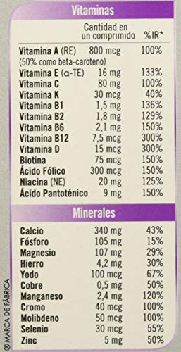 - Fórmula especialmente equilibrada con 13 vitaminas y 11 minerales, con vitaminas del grupo B, alto contenido en vitamina D y con biotina, ácido fólico, calcio, hierro o magnesio, entre otros