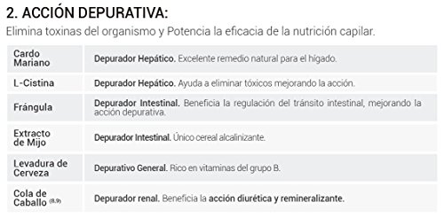- Ingredientes: quinoa, MSM, levadura de cerveza, extracto de mijo, extracto de cebolla, quercetina, zinc, L-cristina, hierro, selenio, biotinza, vitamina B12, vitaminas del grupo B (B1, B2, B3, B5, B6), cardo mariano, frángula, cola de caballo