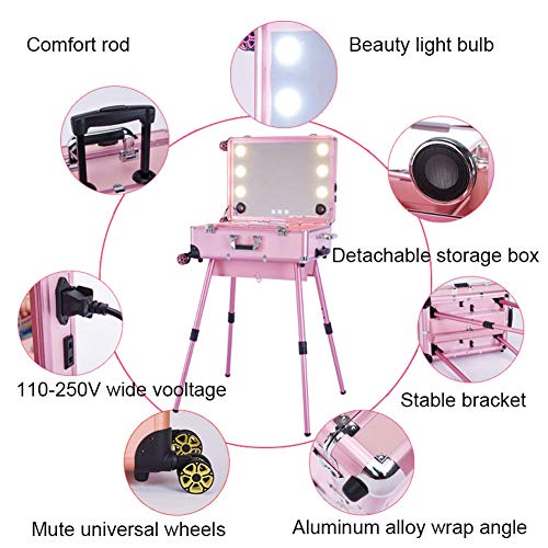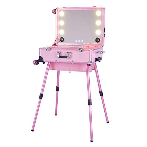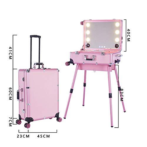KINYNE Trolley Maletín De Maquillaje con Pantalla Completa Espejo LED Y Patas Ajustables + Heavy Duty Maquillaje Plegable Telescopic Artist Director Silla De Madera Plegable,Pink