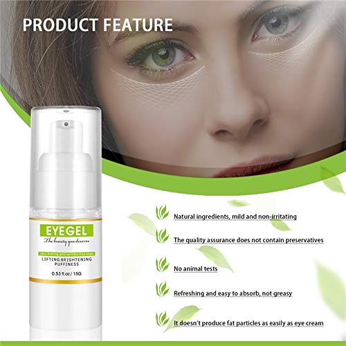 - Antienvejecimiento y reafirmante: Este gel para ojos reduce efectivamente la aparición de arrugas, líneas finas, patas de gallo, hinchazón, ojeras, bolsas debajo de los ojos y flacidez alrededor de los ojos