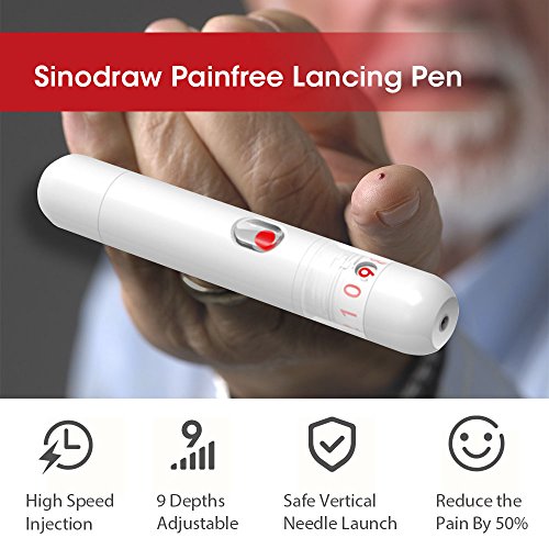 - ? Dispositivo de punción indolora Sinodrew : La nueva estructura de expulsión estable. El diseño ergonómico da como resultado una buena experiencia. El dispositivo, combinado con 9 configuraciones de profundidad diferentes, reduce efectivamente el dolor.