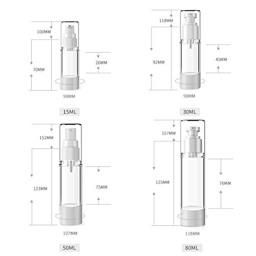 - ☆ Disponible en cinco tamaños (15 ml, 30 ml, 50 ml, 80 ml, 100 ml) para que pueda ponerlo fácilmente en una bolsa, mochila, maletín o maleta con ruedas.