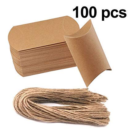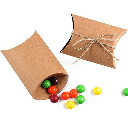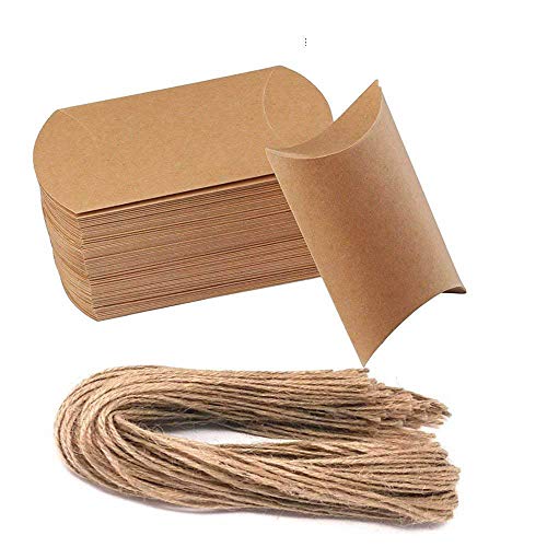 - 50pcs Kraft Paper Pillow Candy Bulk Box con 50 piezas de yute twine, corbata una cruz o nudo de lazo, más elegante y romántico, cada caja mide 4.5 "x 2.7" x 1.3 ".grande que otra