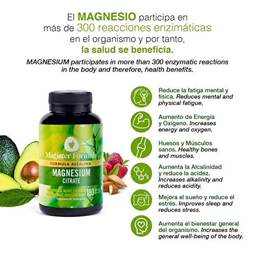 - QUÉ ESPERAR DE NUESTRO CITRATO DE MAGNESIO: Siendo el Magnesio un mineral esencial que participa en más de 300 reacciones enzimáticas, una suplementación constante en el tiempo ayuda en el funcionamiento correcto de nervios, músculos, formación de huesos y el metabolismo energético. Es recomendable para personas que llevan un estilo de vida activo y personas que quieren mantener su salud y energía en buen estado.