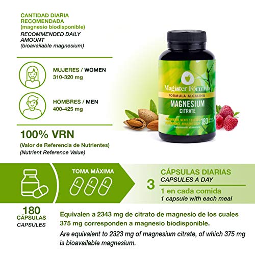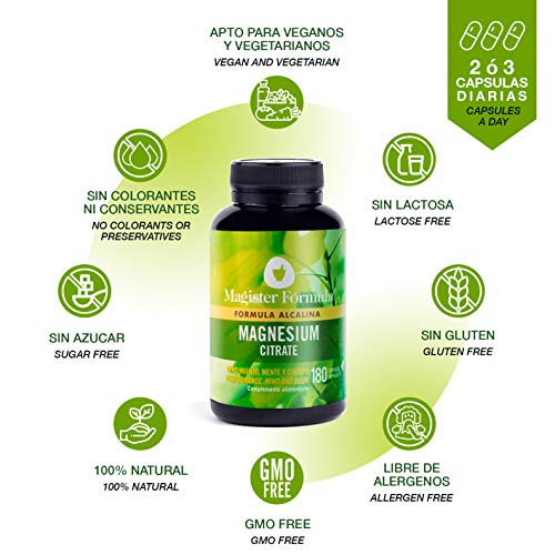 Citrato de Magnesio 2400mg | Efecto Alcalino | Alta Dosis de Magnesio Elemental Puro | 375mg de Biodisponibilidad | Suplemento 180 Cápsulas | Más Oxígeno y Energía | Reduce Cansancio y Mejora el Sueño