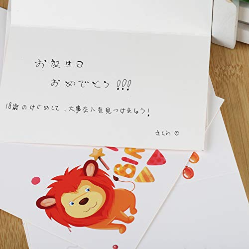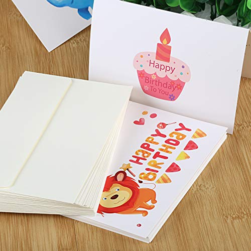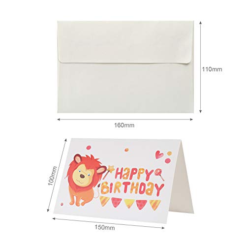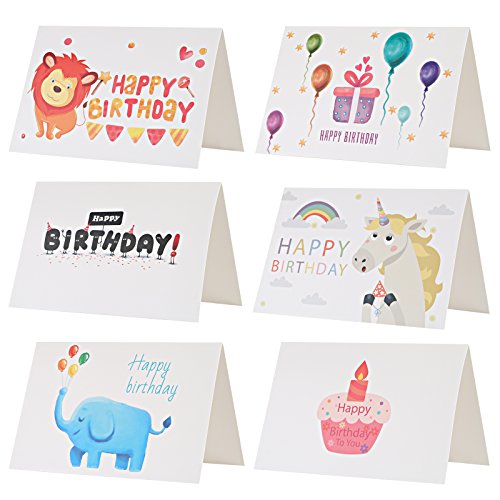 Kesote Conjunto de 24 Tarjeta de Cumpleaños Tarjeta de 6 Estilos de Lindos Dibujos de Elefante, León, Globos, Unicornio, Pastel y Happy Birthday 24 Tarjeta de Cumpleaños para Niños