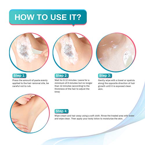 - 【Fácil de Usar】 Equipado con espátula, fácil de usar y raspar. Aplique la crema depilatoria de manera uniforme sobre la piel con la espátula y espere 5 minutos, luego use una espátula para probar si el vello se puede quitar en un área pequeña. Si no es fácil de quitar, puede dejarlo unos minutos más. Enjuague con agua tibia después de raspar.
