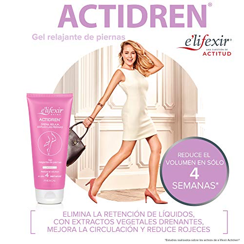 - Elifexir actidren: gel reduce el volumen y calma las piernas, reduciendo los líquidos acumulados en rodillas y tobillos y mejorando la microcirculación; reduce liquidos acumulados, sensación de descanso y relax, acción refrescante, hidratación.