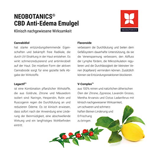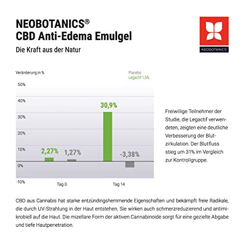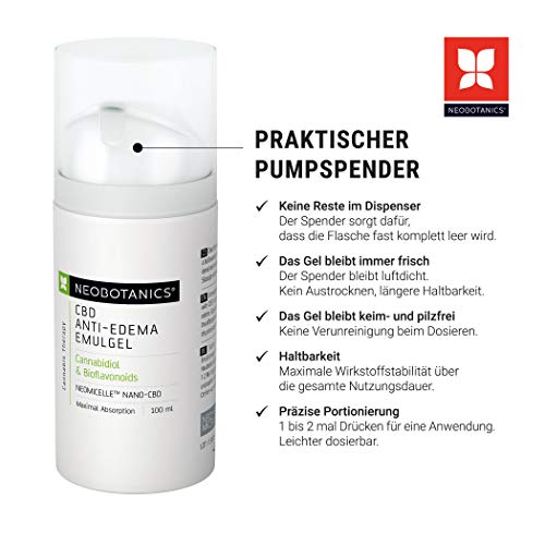 - ✔ NANO CBD la próxima generación de CBD. El NeoMicelle Nano-CBD, que fue desarrollado dentro de nuestro programa farmacéutico, es una parte integral de todos los productos NEOBOTANICS CBD. CBD Edema Emulgel es una innovadora combinación de antiinflamatorio, canabidiol que regenera los nervios (CBD) e ingredientes cosméticos activos naturales.